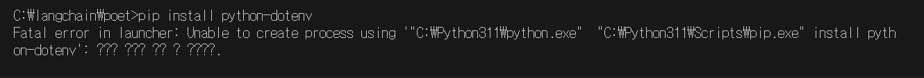 오류 코드 Fatal error in launcher: Unable to create process using 해결방법 경로 때문에 발생하는 오류입니다. pip 명령어 앞에 python -m 을 붙여준다. ex) python -m pip install XXX 또는 python -m 을 매번 붙여서 쓰기