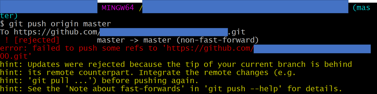 현재 지점의 팁이 원격 지점 뒤에 있으므로 업데이트가 거부되었습니다. 다시 누르기 전에 원격 변경 사항(예: 'git pull...')을 통합합니다. 자세한 내용은 'git push --help'의 '빨리 감기 관련 참고'를 참조하십시오.