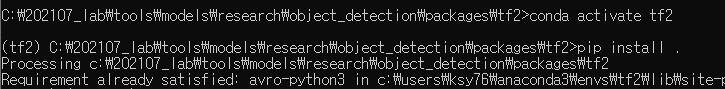 - 먼저 cmd 창을 열어 아까 tf2가 있던 디렉토리로 이동한다(\tools\models\research\object_detection\packages\tf2)