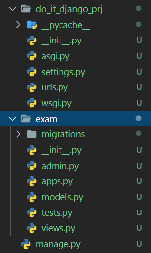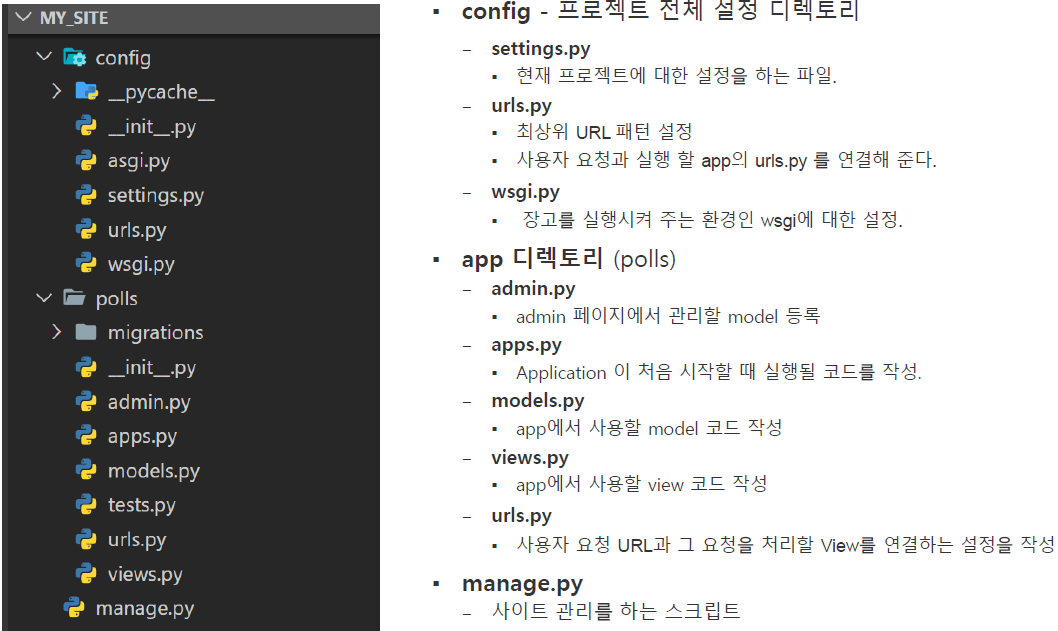 - app 생성: 회원관리, 게시판, 상품관리 등 프로젝트를 구성하는 하위 서비스를 담당할 앱 생성