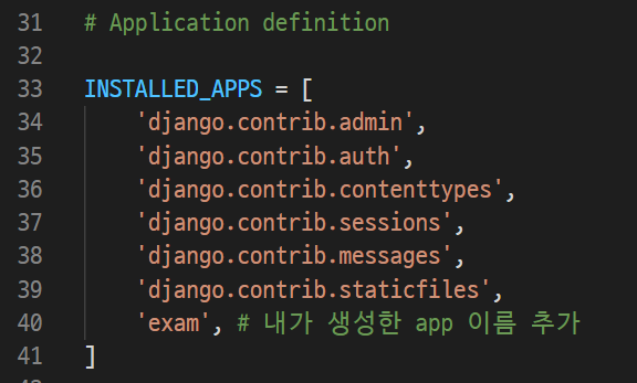 ① INSTALLED_APPS에 내가 추가한 app이름 추가(대략 39번 라인에 추가)
